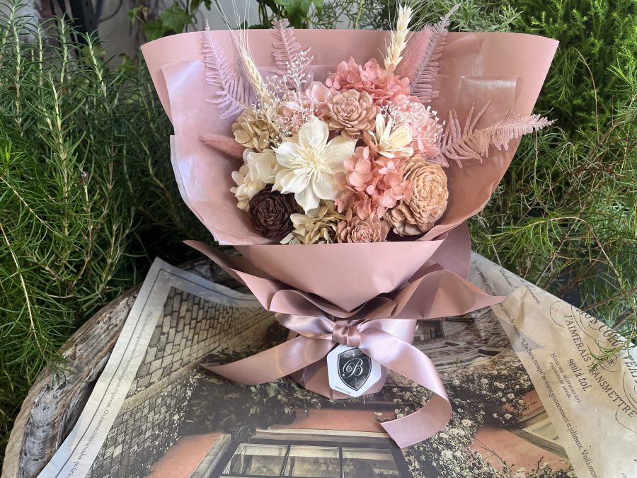 花瓶を用意する必要がなく、そのまま飾れるスタンディングブーケは、ご自宅用のギフトとしても人気があります。